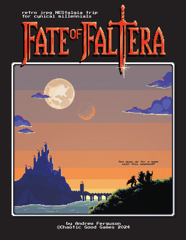 Our world is falling apart and it's all DARK TYRANT's fault. Brave college grads embark on a quest to take him out and set things straight.A boardgamey combat-driven adventure that harkens back to a time lost in the glow of a CRT. FalTera packs the gems of our beloved classic jrpgs into a concise pen & paper package (and doesn't spare the cynicism of being an adult in post-pandemia).👇 PLAYTESTERS AND PROOFREADERS WANTED!